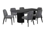 The Astra 7PC Dining Table Set combines modern design with exceptional functionality. Crafted with an MDF black finish, the table features rounded edges and two semicircle pedestals with fluted detailing, giving it a contemporary edge. Paired with Venice Slate chairs and embossed midnight legs, this set is built for both comfort and durability. Ideal for family dinners or hosting guests, the Astra Dining Set adds a stylish touch to any dining room.