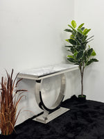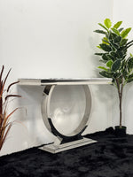 Transform your space with the Console Table from Furniture Roots. This stylish table features a sleek grey marble top that adds a modern touch to any room. Supported by strong silver stainless steel legs, this table is not only beautiful but also sturdy, making it a great addition to your home.