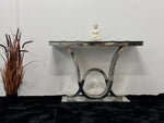 Add a touch of elegance to your home with the Console Table from Furniture Roots. This stylish table features a stunning black marble top that stands out beautifully in any room. Supported by strong silver stainless steel legs, it offers both durability and a modern look.