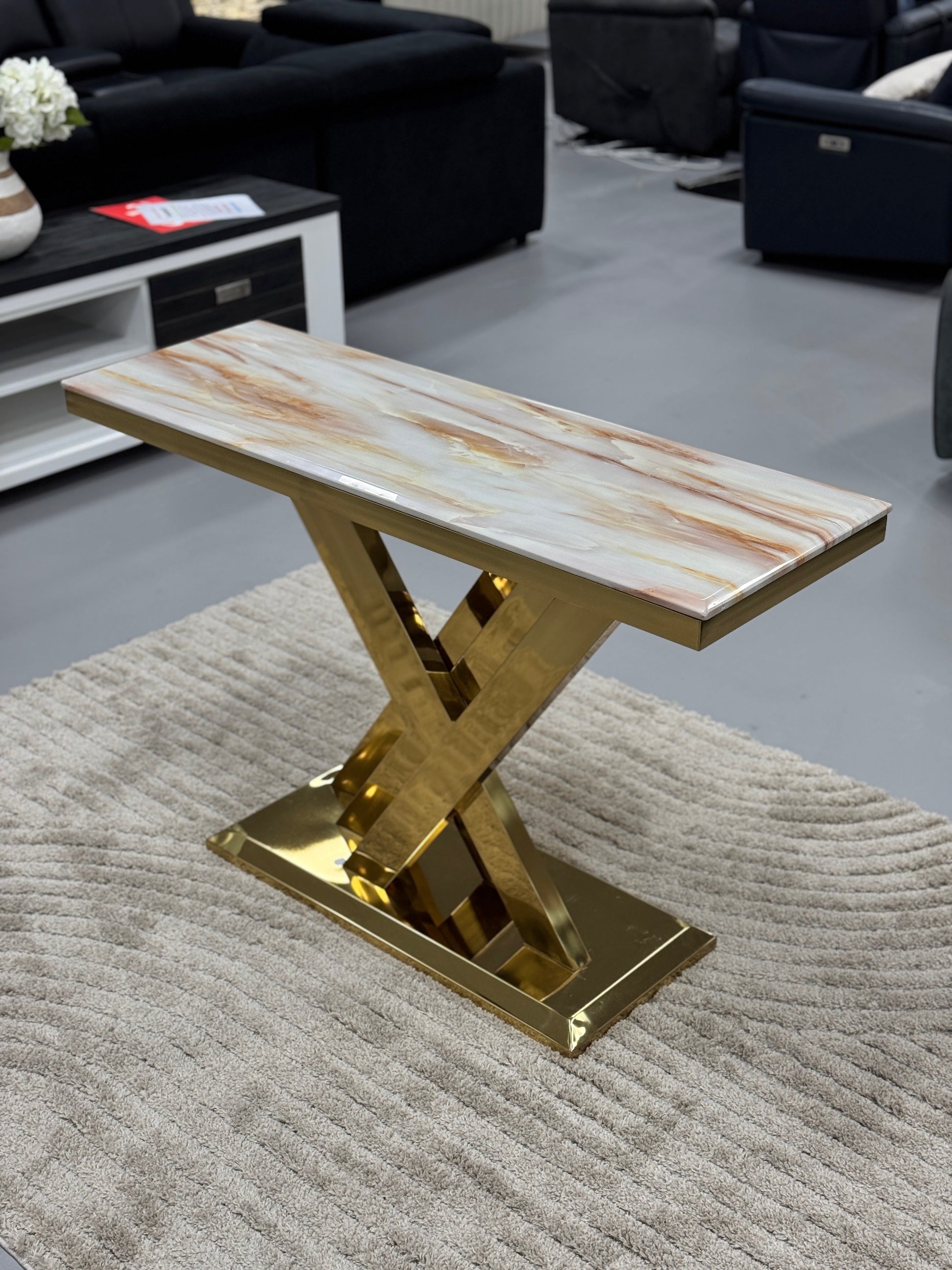 The gold stainless steel legs provide strong support and a modern look, making this table both sturdy and eye-catching. With plenty of space on top, you can showcase your favourite decor items, hold keys, or display family photos with ease.